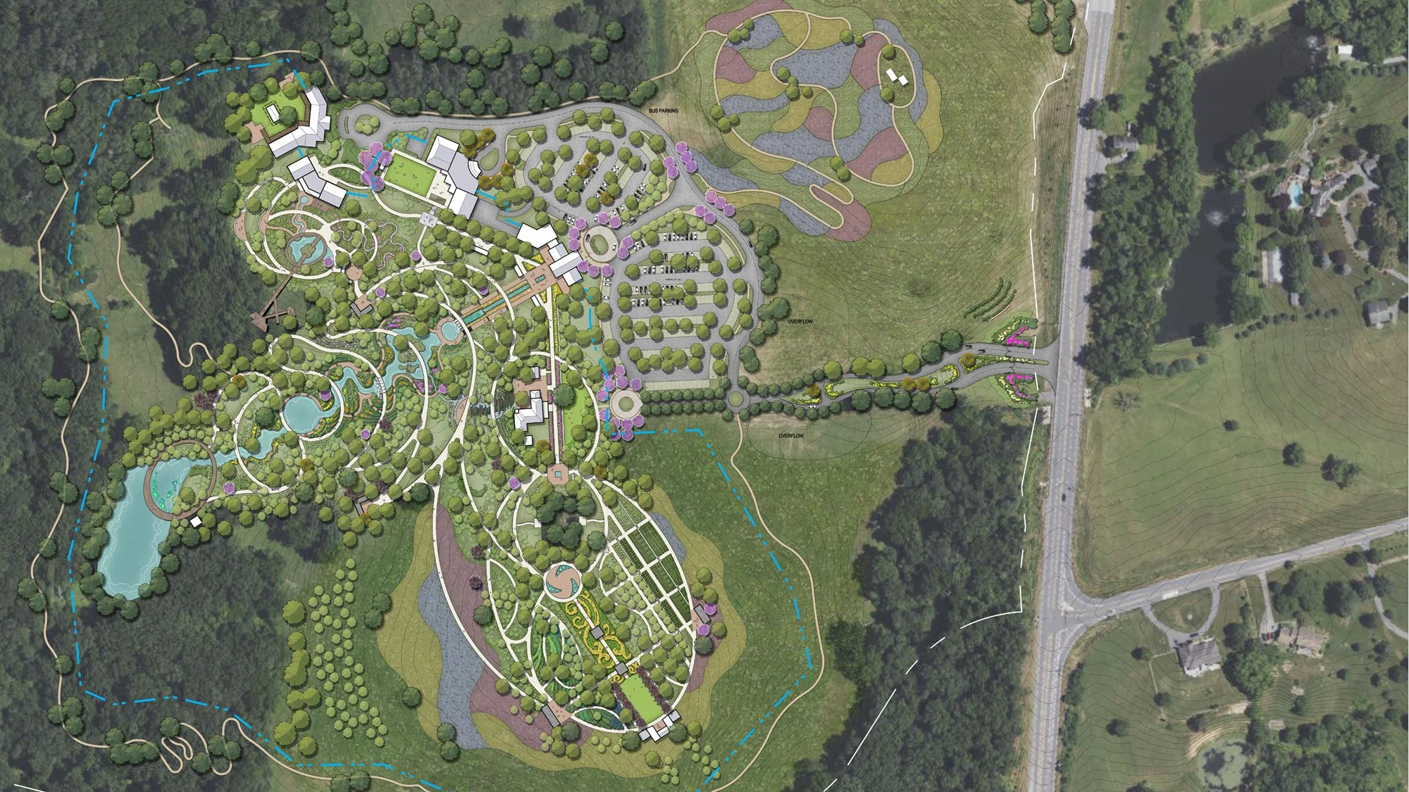 The Master Plan proposes two conceptual axes organizing a series of themed gardens. The Natural Axis follows water features spilling down the sloping terrain. Plantings showcase display collections of native species. The Cultural Axis runs along the long ridge on which the home and cemetery sit. These gardens express myriad relationships among people and plants while celebrating the site and region’s diverse heritage. A family-oriented Wonder Garden sits at the Axes’ intersection. The Plan also includes an event center to generate revenue, visitor center to provide amenities, and daycare to serve local families.