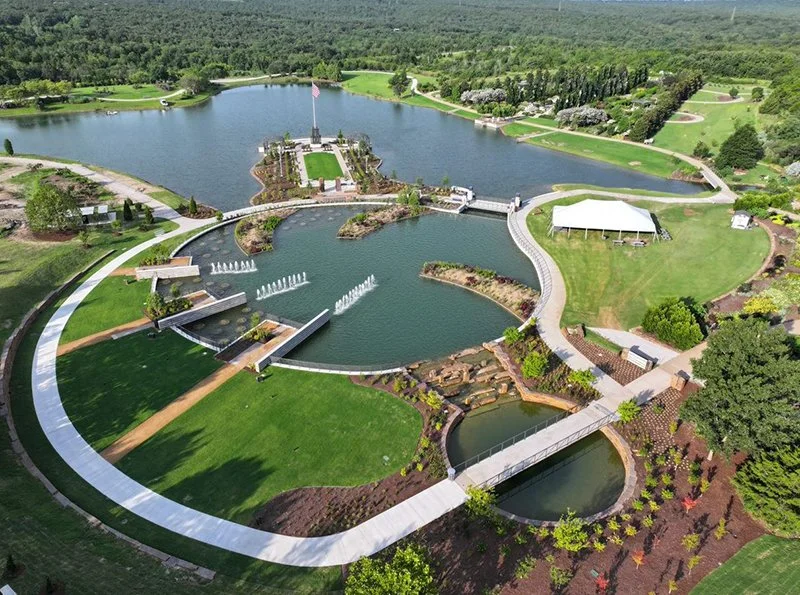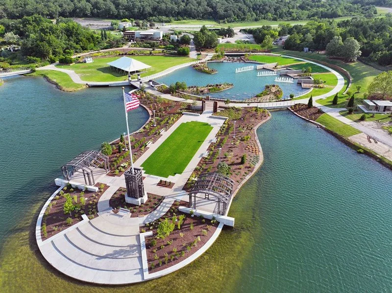 Extending into the property’s central lake, the peninsular Liberty Garden is the civic and celebratory heart of the Tulsa Botanic Garden. 3. Fromme Design, Howell Vancuren (Tulsa, OK), and Staff collaborated with the donors to establish a sequence of processional garden spaces: The Entry Grove, Civic Lawn, Flag Terrace, and Waterside Stairs.