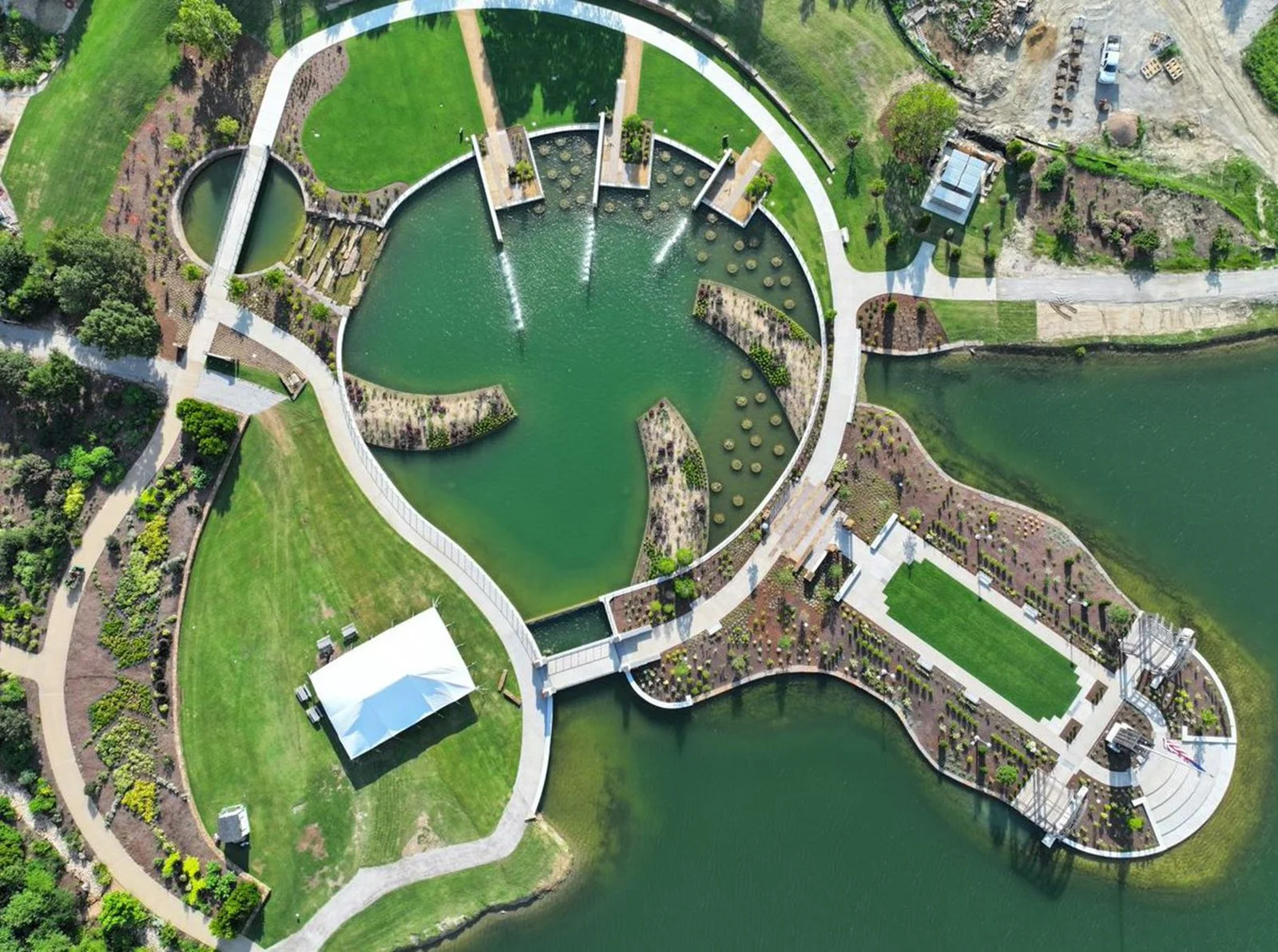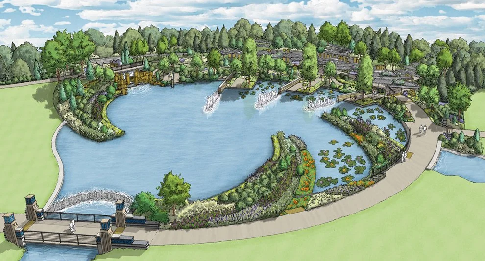 Visitors discover welcome shade beneath two vine-bedecked arbors flanking the central axis and flagpole. Ornamental railings echo the entry gate and create balconies overlooking the lake. A series of generous seating terraces step gently down the Peninsula’s terminus, encouraging people to linger and enjoy the panoramic vista of water, sky, and gardens surrounding the lake. The Liberty Garden opened in 2023.