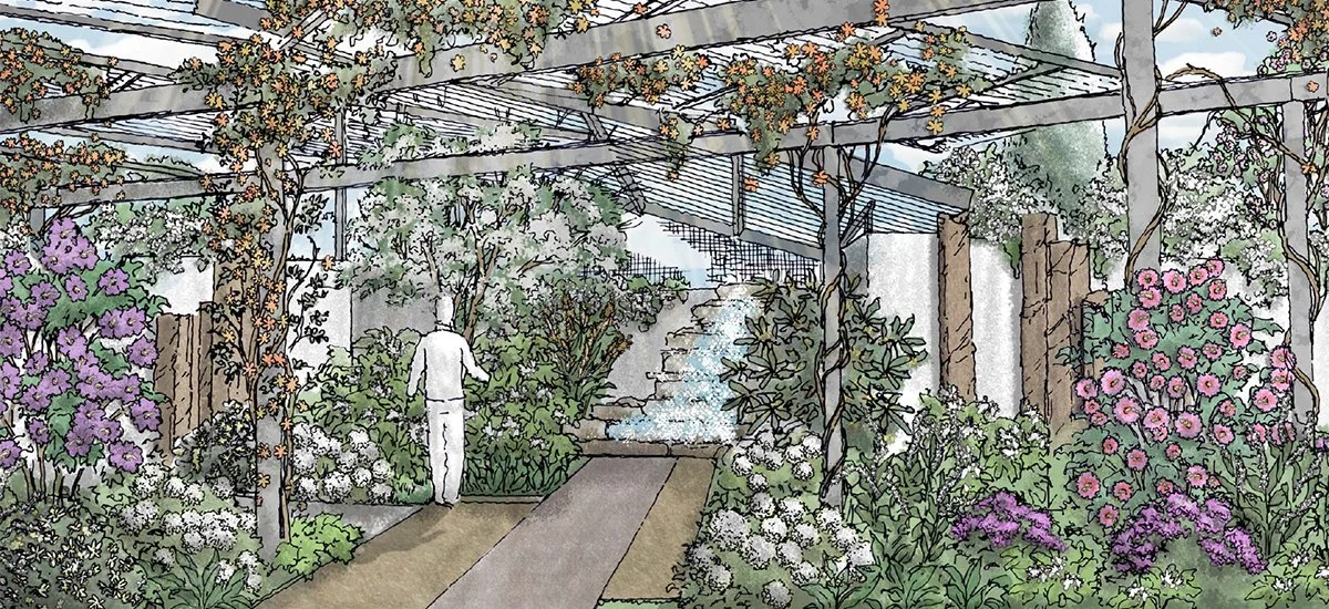 The All Seasons Garden wraps around the large central liquid “mirror” of the Lotus Pool, creating a loop beginning and concluding with the existing and future Visitor Center. People follow the shaded route beneath a vine-covered arbor along the Great Wall. This sculptural composition of stone, concrete, and glass holds back the hillside against which both gardens nestle. “Floating” lath house ceilings cover three Grottos set into the Wall, each showcasing a unique water feature and plantings thriving in the shade and frost protection.